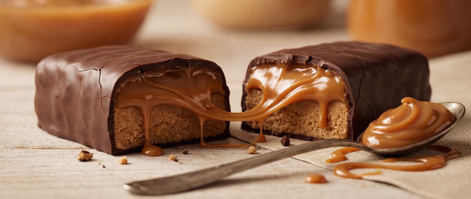 Caramelo de leite (leite Integral e/ou leite reconstituído, gordura vegetal, edulcorante Isomalte e sucralose, umectante sorbitol e glicerol, espessante polidextrose e gelatina, estabilizante pectina cítrica e citrato de sódio, regulador de acidez bicarbonato de sódio, conservante sorbato de potássio, aromatizante idêntico ao natural e emulsificante lecitina*), cobertura proteica sabor chocolate meio amargo (gordura vegetal, soro de leite em pó, leite em pó integral, cacau em pó natural, estabilizantes maltitol e polidextrose, emulsificantes lecitina*e polirricinoleato de poliglicero e aromatizante idêntico ao natural), caseinato de cálcio, proteína de soro do leite concentrada, caramelo salgado crocante (óleo de palma, sal, edulcorantes isomalte e maltitol, estabilizante polidextrose e regulador de acidez bicarbonato de sódio), gordura vegetal, inulina de chicória, proteína de soro do leite isolada, doce de leite em pó (doce de leite natural, leite em pó integral, maltodextrina, corante caramelo e antiumectante fosfato tricálcico), cacau em pó red, edulcorantes maltitol e glicosídeos de esteviol de Stevia rebaudiana Bertoni, estabilizante polidextrose umectante glicerol, emulsificante lecitina, antiumectante fosfato tricálcico, aromatizante e antioxidante extrato de alecrim.